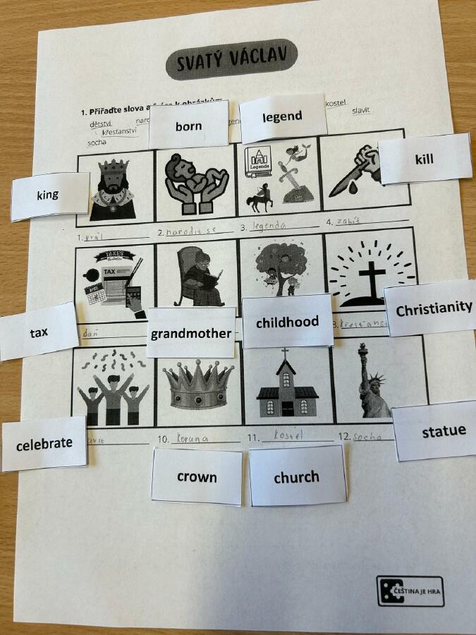 Procvičili jsme si slovní zásobu jak v češtině (cvičení pro cizince), tak v angličtině. Rozhodovali jsme se, zda tvrzení o sv. Václavovi jsou pravdivá, či nikoli.