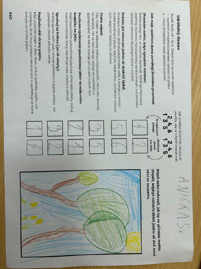 V 6.kole hledali prvňáci možná řešení k udržitelnému domovu. Tato část je vedla, aby aktivně přemýšleli o svém vlastním chování a vlivu na životní prostředí (při kreslení a psaní používat obě strany papíru, sprchovat se krátce, cca 3 min, zhasínat světla při opouštění místnosti, třídit odpad, používáme opakovaně použitelnou láhev na vodu a krabičku na jídlo, zda nám stačí jíst maso jednou až dvakrát týdně). Tím podpořili rozvoj vlastní odpovědnosti a akčních kompetencí.
