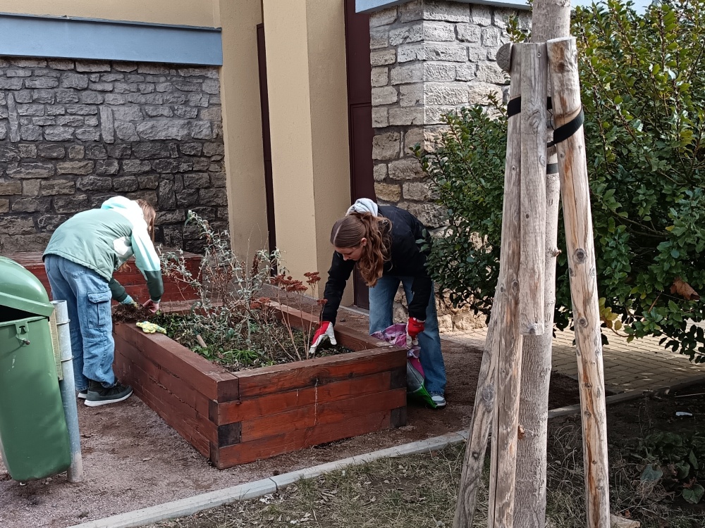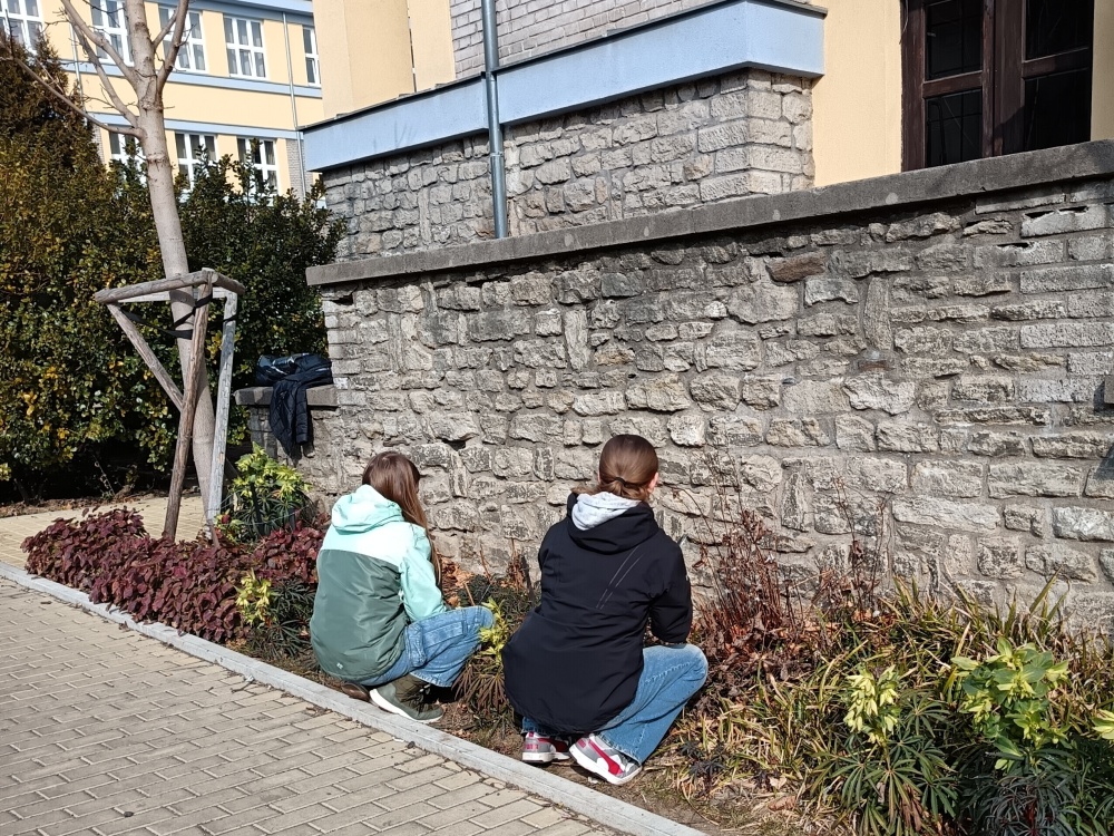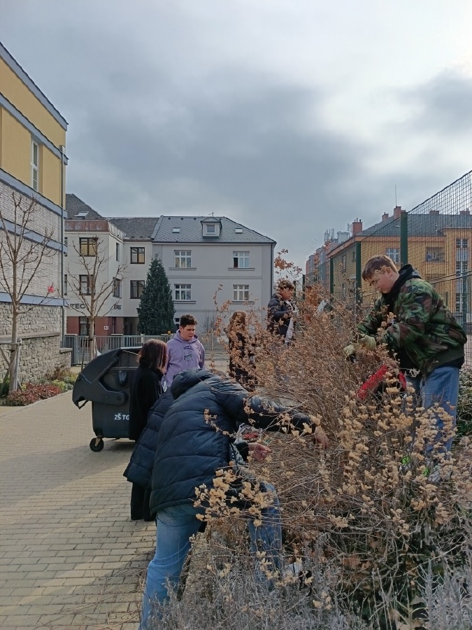Počasí se zlepšilo, a tak se mohli sedmáci konečně vydat o pracovních činnostech ven. Ve středu čistili žáci ze 7.C venkovní záhon u cesty k jídelně. Ostříhali suché odumřelé květiny a bylinky a vysbírali suché listy.