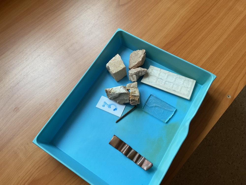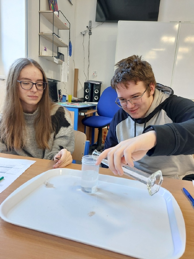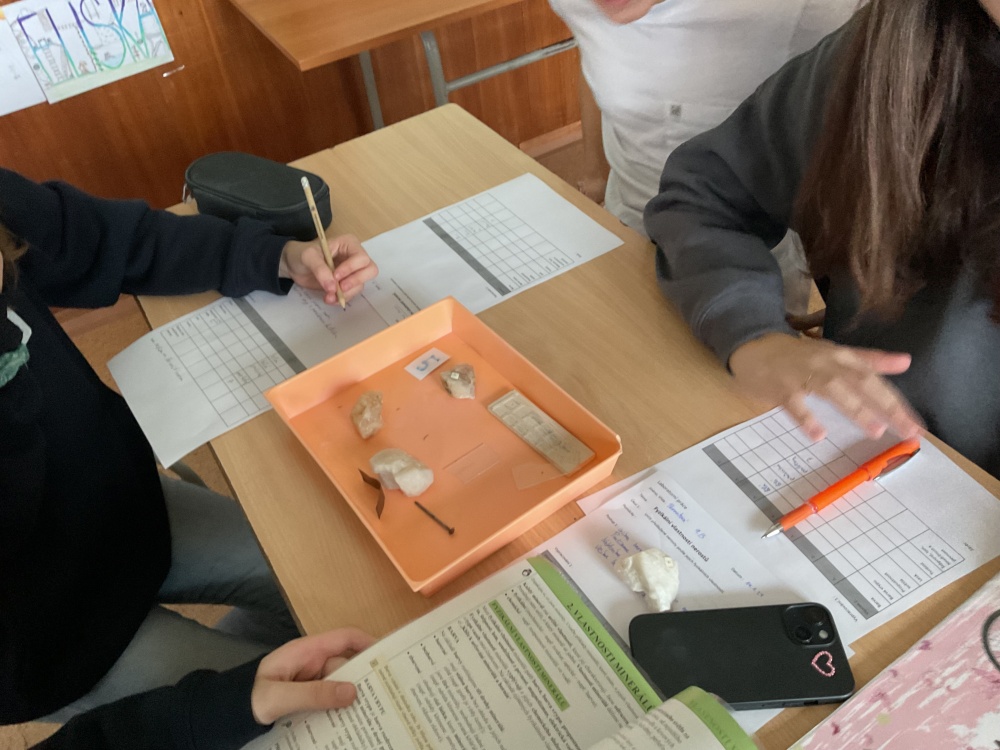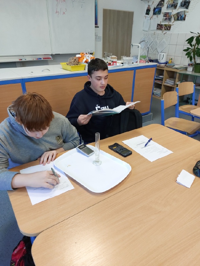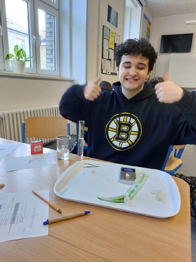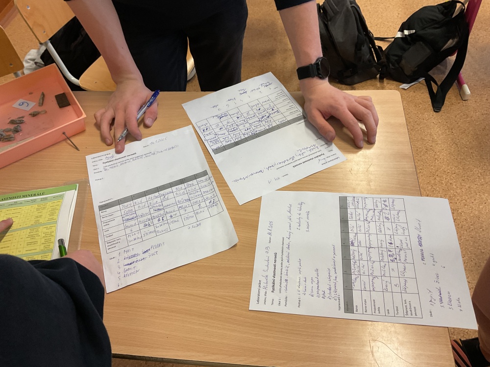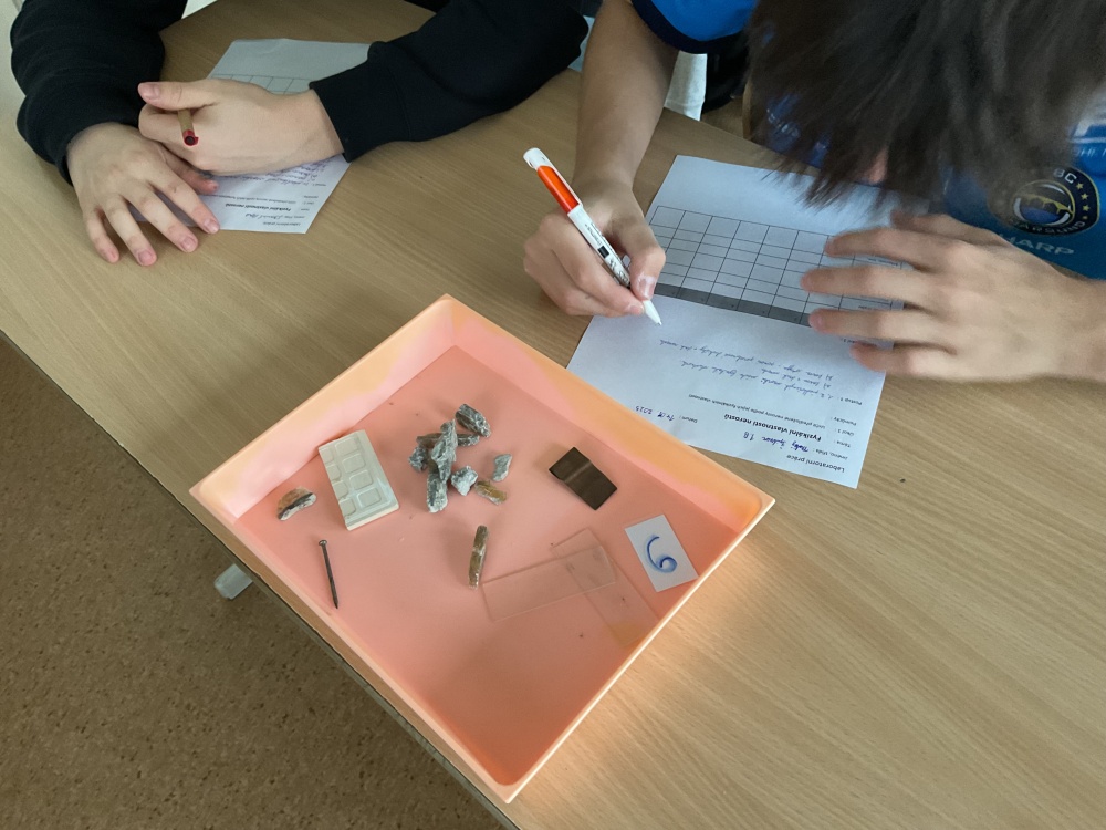 Během posledních dvou laboratorních prací se žáci 9.B věnovali zkoumání fyzikálních a chemických vlastností nerostů. Využívali nejen znalosti geologie, která je náplní přírodopisu 9.ročníku, ale také si zopakovali některá témata z fyziky, matematiky a chemie. Vyzkoušeli si prakticky určení optických vlastností nerostů a stanovení tvrdosti minerálu pomoci Mohsovy stupnice. V rámci science dvouhodiny si zopakovali měření hustoty těles a její výpočet, elektrickou vodivost a magnetismus látek. V chemické části se věnovali rozpustnosti minerálů ve vodě a v kyselině.