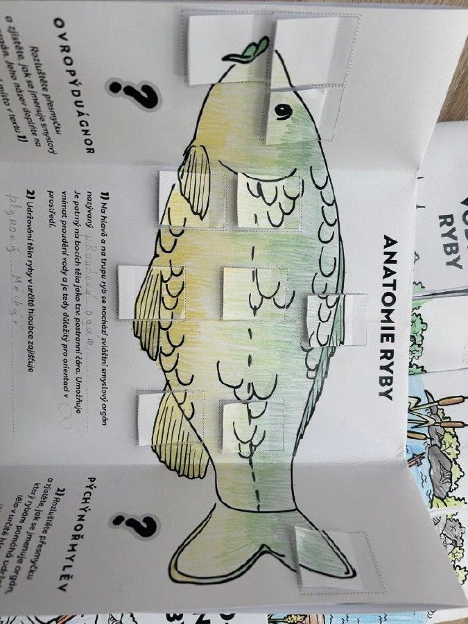 Ve škole si děti vytvořily lapbook o rybách. V něm si zaznamenaly informace o různých druzích ryb. Popsaly jednotlivé části ryby, seznámily s ekosystémem rybníka, s životním cyklem ryby.